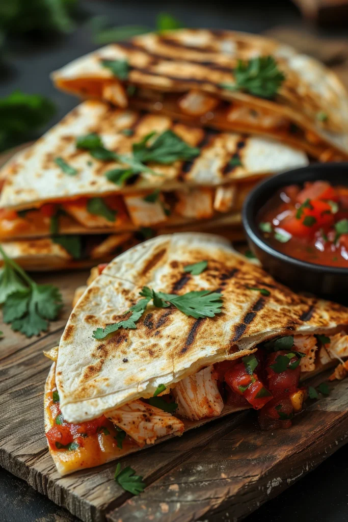 Spray a cold skillet with the nonstick spray and heat over medium heat. Place a tortilla in the pan and sprinkle with 1/8 cup cheese. Add about a quarter of the chicken mixture and top with another 1/8 cup cheese. Cover with another tortilla and cook for two to three minutes or until golden brown. Flip the quesadilla over and cook for an additional two minutes. Remove from the heat and cut into edges. Keep warm while frying the remaining quesadillas. Serve with salsa, scallions, and fat-free sour cream.