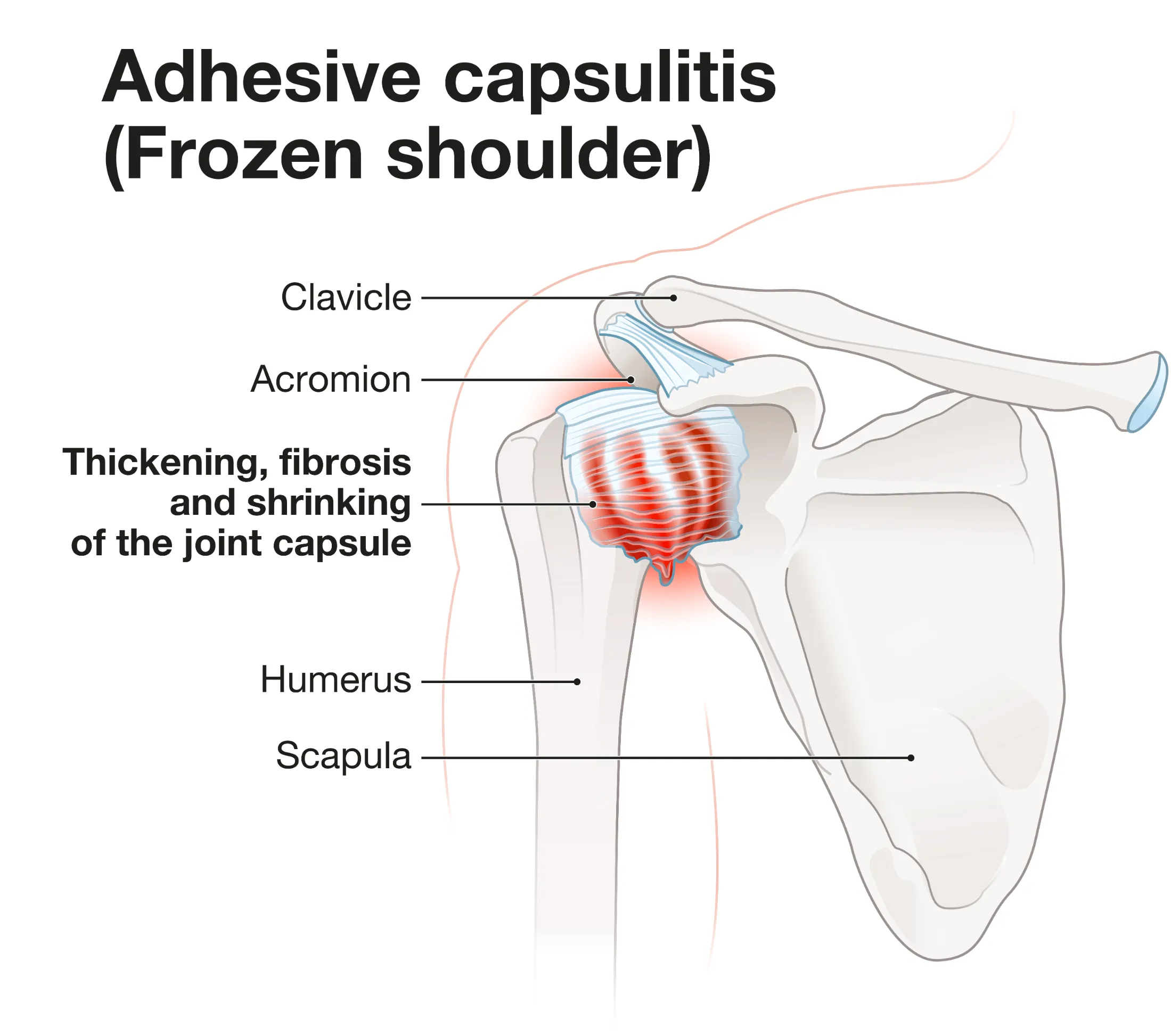 This patient had developed adhesive capsulitis, more commonly known as frozen shoulder. It gets that name from the fact that the condition causes the shoulder to “freeze up” after a period of intense pain.